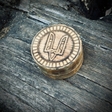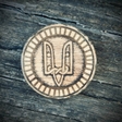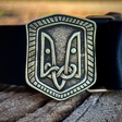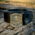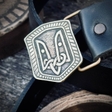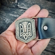 Шкіряний ремінь, оздоблений пряжкою ручного лиття, з зображенням двозуба князя Святослава.