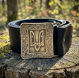 Шкіряний ремінь, оздоблений латунною пряжкою ручного лиття, з зображенням двозуба князя Святослава.