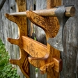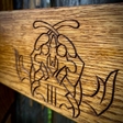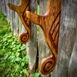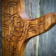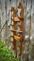 Самі полички для зброї виготовлені у формі кочетів для човнів. Кочети (або щучки) - це спеціальні дерев’яні кріплення, які встановлювалися вздовж борту довгого човна, наприклад драккара, для надійної фіксації весел під час плавання. Такий дизайн надає виробу автентичного вигляду та відтворює атмосферу скандинавських морських традицій.